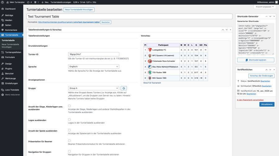 Für WordPress Nutzer bieten wir ein Plugin zum Einbinden von Turniertabellen und Spielergebnissen. Du findest es im offiziellen WordPress Verzeichnis unter dem Namen „MeinTurnierplan“ bzw. hier: https://de.wordpress.org/plugins/meinturnierplan/